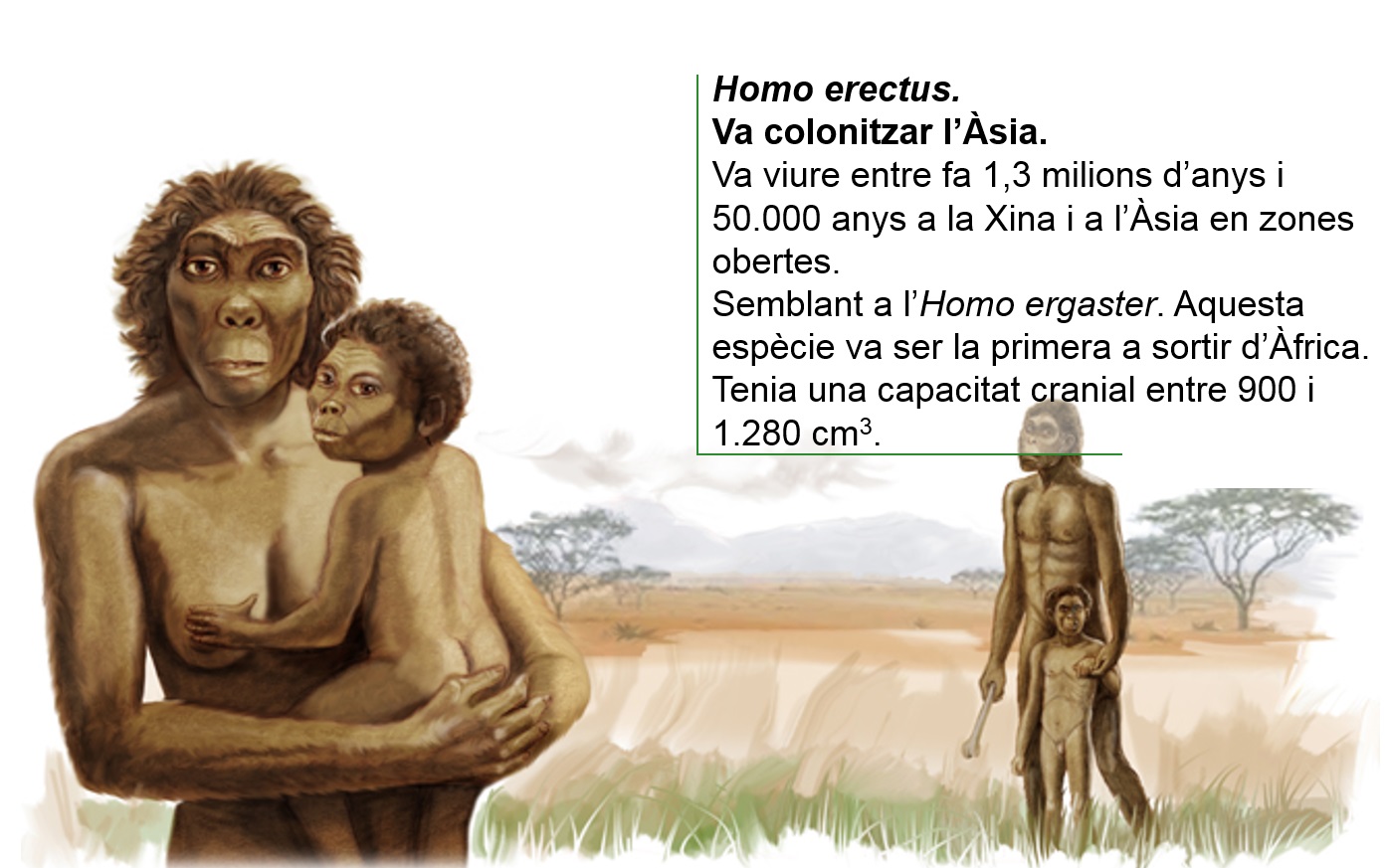 L'Homo erectus va viure en un període que abastava des de 1.600.000 anys fins a uns 300.000 anys a.C. Segons sembla, deriva d'alguns Homo habilis i es considerat per molts investigadors com l'homínid predecessor immediat de l'Homo sapiens.